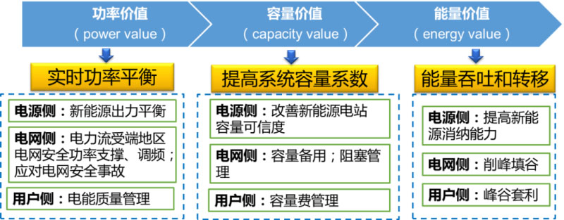 開源方面,需通過多樣化儲(chǔ)能應(yīng)用場(chǎng)景、豐富商業(yè)模式,實(shí)現(xiàn)儲(chǔ)能多功能復(fù)用下的價(jià)值挖掘;此外,借助新型能源技術(shù)進(jìn)一步激發(fā)儲(chǔ)能價(jià)值發(fā)揮。儲(chǔ)能作為一種靈活性極強(qiáng)的調(diào)節(jié)資源,其具備功率價(jià)值(power value)、容量?jī)r(jià)值(capacity value)和能量?jī)r(jià)值(energy value),在電力系統(tǒng)不同環(huán)節(jié)、不同場(chǎng)景通過單種或多種功能組合發(fā)揮不同作用。
