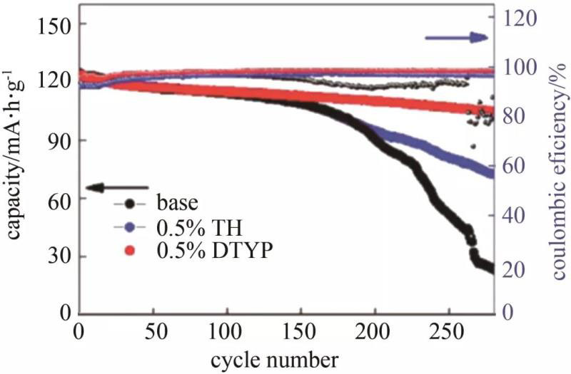 Li等報(bào)道了一種新型的電解液添加劑,二乙基(噻吩-2-甲基)磷酸酯(DTYP),它集成了3個(gè)單個(gè)分子的功能。DTYP可以有效穩(wěn)定高壓正極與常規(guī)碳酸鹽電解液之間的界面,防止過(guò)渡金屬的溶解。同時(shí)也會(huì)提高電解液的熱穩(wěn)定性。實(shí)驗(yàn)表征和計(jì)算表明,DTYP添加劑會(huì)優(yōu)先被氧化形成CEI,CEI中的噻吩和磷酸鹽結(jié)構(gòu)能有效抑制正極材料與電解液間的副反應(yīng)。如圖14所示,在含有DTYP添加劑的電解液體系中,LiNi0.5Mn1.5O4正極電池在60 ℃、3~4.9 V電壓范圍內(nèi)、以1 C的倍率循環(huán)280周,容量保持率高達(dá)84%,庫(kù)侖效率也保持在較高的水平。