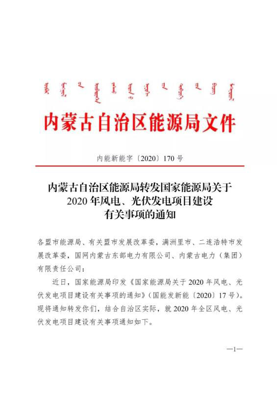 近日,國家能源局發(fā)布了《國家能源局關(guān)于2020年風(fēng)電、光伏發(fā)電項(xiàng)目建設(shè)有關(guān)事項(xiàng)的通知》(國能發(fā)新能[2020]17號,以下簡稱17號文件),為抓好內(nèi)蒙古自治區(qū)2020年風(fēng)電和光伏發(fā)電行業(yè)管理,持續(xù)推動(dòng)內(nèi)蒙古自治區(qū)風(fēng)電、光伏發(fā)電科學(xué)有序健康發(fā)展,內(nèi)蒙古自治區(qū)能源局將國家能源局通知轉(zhuǎn)發(fā)各盟市,并結(jié)合自治區(qū)發(fā)展實(shí)際,提出了2020年風(fēng)電和光伏發(fā)電項(xiàng)目建設(shè)的具體要求。