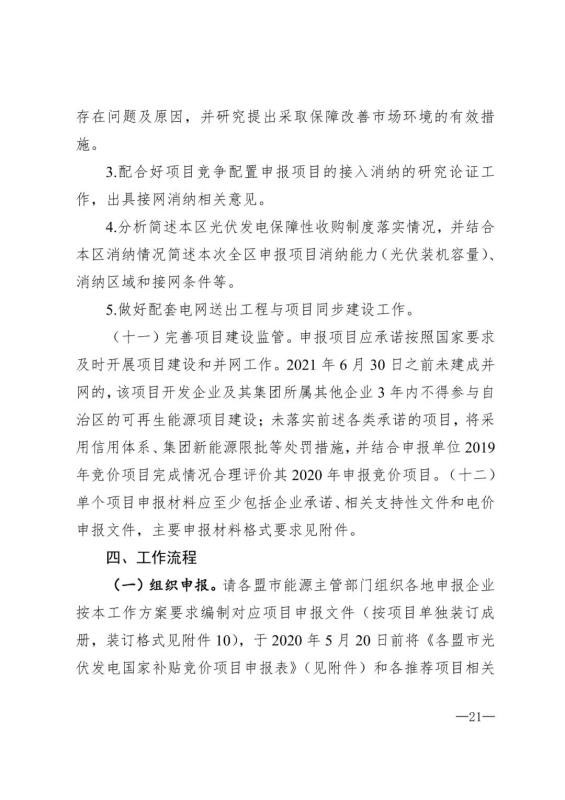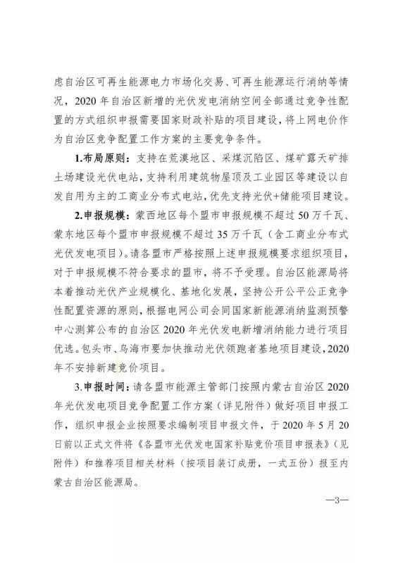 此外,文件要求申報(bào)項(xiàng)目應(yīng)在2020年12月31日前建成并網(wǎng),各盟市能源主管部門于2020年5月20日前將擬新建的補(bǔ)貼競價(jià)項(xiàng)目報(bào)送內(nèi)蒙古自治區(qū)能源局。