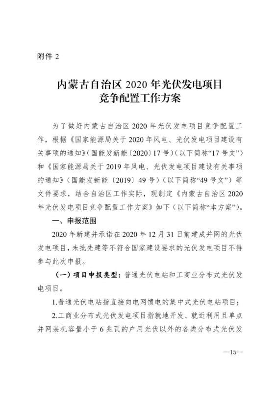 二是有序推進(jìn)需要國家財(cái)政補(bǔ)貼的光伏發(fā)電項(xiàng)目。綜合考慮我區(qū)可再生能源電力市場化交易、可再生能源運(yùn)行消納等情況,2020年內(nèi)蒙古自治區(qū)新增的光伏發(fā)電消納空間全部通過競爭性配置的方式組織申報(bào)需要國家財(cái)政補(bǔ)貼的項(xiàng)目建設(shè),將上網(wǎng)電價(jià)作為內(nèi)蒙古自治區(qū)競爭配置工作方案的主要競爭條件。