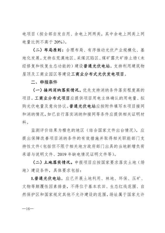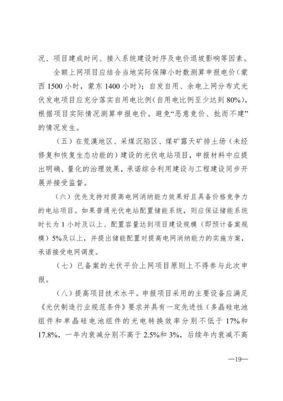 根據(jù)內(nèi)蒙古自治區(qū)黨委十屆十一次全委會暨全區(qū)經(jīng)濟(jì)工作會議精神,2020年光伏發(fā)電競價(jià)項(xiàng)目支持在荒漠地區(qū)、采煤沉陷區(qū)、露天煤礦排土場建設(shè)光伏電站;支持利用建筑物屋頂及工業(yè)園區(qū)等建設(shè)以自發(fā)自用為主的工商業(yè)分布式電站,工商業(yè)分布式光伏發(fā)電項(xiàng)目支持全部自發(fā)自用和余電上網(wǎng)兩類項(xiàng)目,其中余電上網(wǎng)項(xiàng)目上網(wǎng)電量比例不高于20%;優(yōu)先支持光伏+儲能項(xiàng)目建設(shè)。
