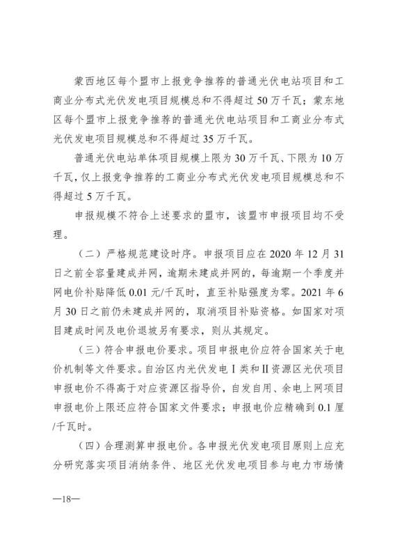 文件明指出,合考慮2020年初步測算的自治區(qū)光伏發(fā)電新增消納能力,以及按照規(guī)?;⒒鼗苿?dòng)光伏發(fā)電產(chǎn)業(yè)發(fā)展的總體思路,研究確定蒙西地區(qū)每個(gè)盟市申報(bào)規(guī)模上限為50萬千瓦、蒙東地區(qū)每個(gè)盟市申報(bào)規(guī)模上限為35萬千瓦(含工商業(yè)分布式光伏發(fā)電項(xiàng)目),包頭市、烏海市2020年不安排新增競價(jià)項(xiàng)目。