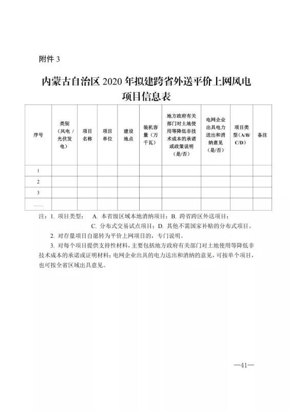 二是重新梳理報(bào)送跨省區(qū)平價(jià)上網(wǎng)風(fēng)電基地項(xiàng)目信息。按照《國家發(fā)展改革委國家能源局關(guān)于積極推進(jìn)風(fēng)電、光伏發(fā)電無補(bǔ)貼平價(jià)上網(wǎng)有關(guān)工作的通知》(發(fā)改能源[2019]19號)和《國家能源局綜合司關(guān)于報(bào)送2019年度風(fēng)電、光伏發(fā)電平價(jià)上網(wǎng)項(xiàng)目的通知》要求,根據(jù)各有關(guān)盟市報(bào)送情況,內(nèi)蒙古自治區(qū)能源局在2019年向國家能源局組織上報(bào)了兩批次不需要國家補(bǔ)貼的跨省區(qū)平價(jià)外送風(fēng)電項(xiàng)目名單。考慮到2019年已經(jīng)向國家報(bào)送項(xiàng)目的相關(guān)信息需要進(jìn)一步完善、2020年還有新增項(xiàng)目等因素,要求有關(guān)盟市能源主管部門重新梳理2020年底前能夠核準(zhǔn)并且開工建設(shè)、按照平價(jià)上網(wǎng)推進(jìn)的跨省區(qū)外送風(fēng)電基地項(xiàng)目。