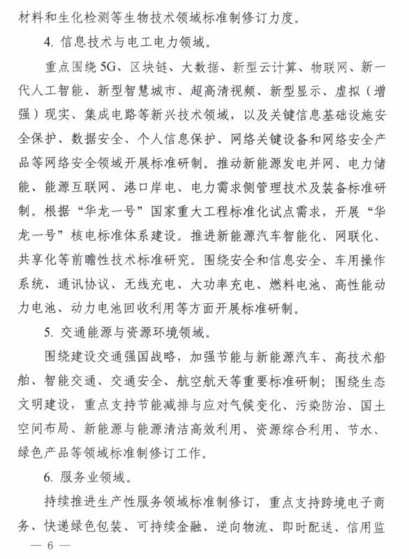 其中,在信息技術(shù)與電工電力領(lǐng)域提到將重點(diǎn)圍繞5G、區(qū)塊鏈、大數(shù)據(jù)、新型云計(jì)算、物聯(lián)網(wǎng)、新一代人工智能、新型智慧城市、超高清視頻、新型顯示、虛擬(增強(qiáng))現(xiàn)實(shí)、集成電路等新興技術(shù)領(lǐng)域,以及關(guān)鍵信息基礎(chǔ)設(shè)施安全保護(hù)、數(shù)據(jù)安全、個(gè)人信息保護(hù)、網(wǎng)絡(luò)關(guān)鍵設(shè)備和網(wǎng)絡(luò)安全產(chǎn)品等網(wǎng)絡(luò)安全領(lǐng)域開展標(biāo)準(zhǔn)研制。推動(dòng)新能源發(fā)電并網(wǎng)、電力儲(chǔ)能、能源互聯(lián)網(wǎng)、港口岸電、電力需求側(cè)管理技術(shù)及裝備標(biāo)準(zhǔn)研制。根據(jù)“華龍一號(hào)”國家重大工程標(biāo)準(zhǔn)化試點(diǎn)需求,開展“華龍一號(hào)”核電標(biāo)準(zhǔn)體系建設(shè)。推進(jìn)新能源汽車智能化、網(wǎng)聯(lián)化、共享化等前瞻性技術(shù)標(biāo)準(zhǔn)研究。圍繞安全和信息安全、車用操作系統(tǒng)、通訊協(xié)議、無線充電、大功率充電、燃料電池、高性能動(dòng)力電池、動(dòng)力電池回收利用等方面開展標(biāo)準(zhǔn)研制。