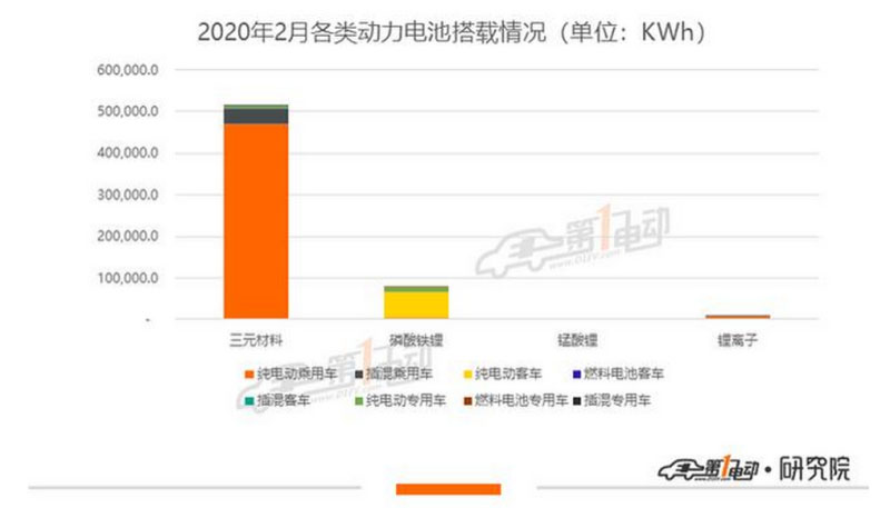 2月三元材料的搭載量為512.1MWh,其中乘用車(chē)占比99.3%,三元材料搭載量占總搭載量的85.8%。磷酸鐵鋰電池依然以搭載純電動(dòng)動(dòng)客車(chē)為主,2月總搭載量為76.6MWh,在月度裝機(jī)中的占比為12.8%。