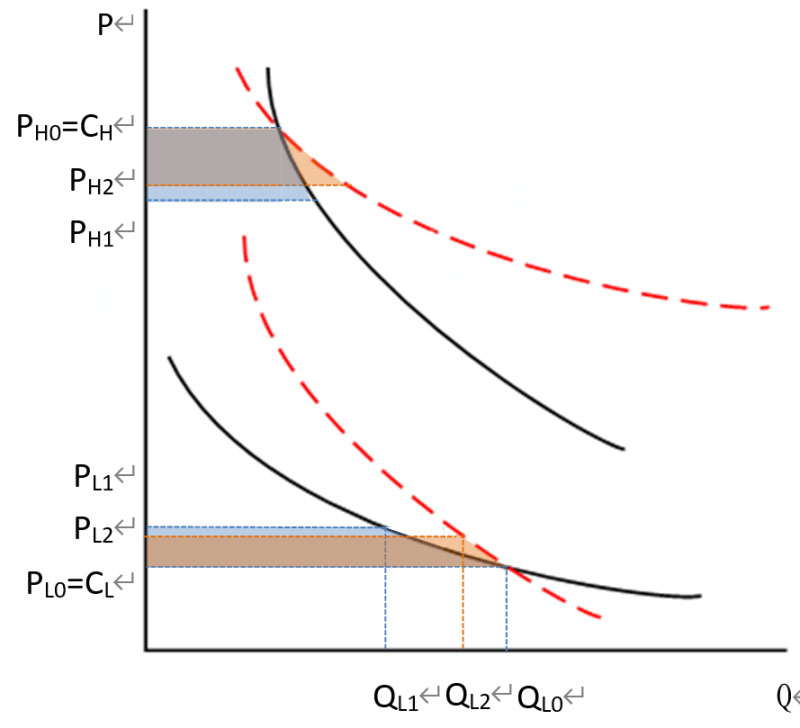 PL1和PH1是“上開口型”交叉補貼執(zhí)行后的電價水平,上述結果表明,在消費者剩余等量增加(或減少)的條件下,“上開口型”交叉補貼導致的電價扭曲比“下開口型”交叉補貼導致的電價扭曲更為嚴重。