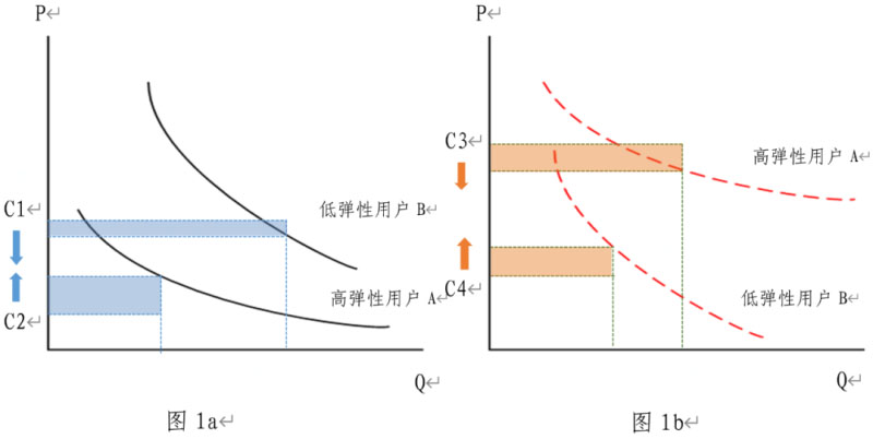 需求曲線的斜率和相對位置確定后,上述兩類電價交叉補貼在量價坐標系中的“開口”形態(tài)就被固定下來,如圖1所示:高彈性用戶向低彈性用戶支付交叉補貼時,生產(chǎn)者剩余增減的絕對值相等(藍色陰影面積),兩條需求曲線圍成了向上開口的形態(tài),可稱之為“上開口型”電價交叉補貼(圖1a);低彈性用戶向高彈性用戶支付交叉補貼時,生產(chǎn)者剩余增減的絕對值也相等(紅色陰影面積),兩條需求曲線圍成了向下開口的形態(tài),可稱之為“下開口型”電價交叉補貼(圖1b)。