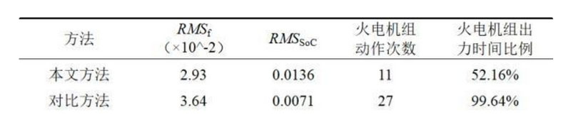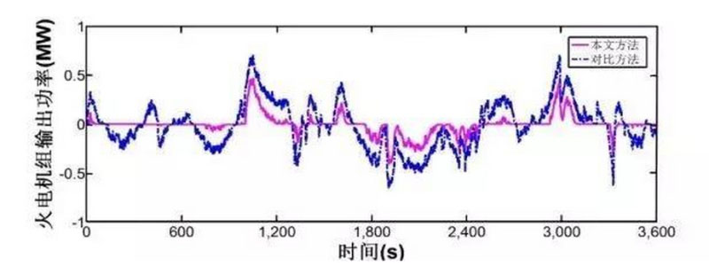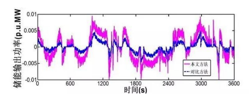 當系統(tǒng)加入60min連續(xù)負荷擾動時,采用本文方法和對比方法的調頻效果如圖4所示,儲能系統(tǒng)和火電機組的輸出功率分別如圖5和6所示,調頻指標如表1所示。