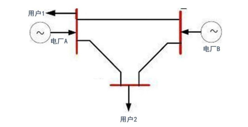 為了便于直觀理解,本文將通過圖解案例的方式對(duì)“魏橋模式”產(chǎn)生的深層次原因進(jìn)行剖析。假設(shè)某個(gè)區(qū)域供電系統(tǒng)為典型的三節(jié)點(diǎn)系統(tǒng),系統(tǒng)中包含兩個(gè)電源及兩個(gè)用戶,圖示網(wǎng)架結(jié)構(gòu)為輸電網(wǎng)結(jié)構(gòu),用戶1與電廠A在同一個(gè)配電網(wǎng)范圍內(nèi)。為簡(jiǎn)化起見,假定兩個(gè)電源均為煤電機(jī)組,兩者在案例中的出力上限均為50MW;用戶1與用戶2接入系統(tǒng)的電壓等級(jí)是相同的,兩者在案例中的負(fù)荷均為50MW。