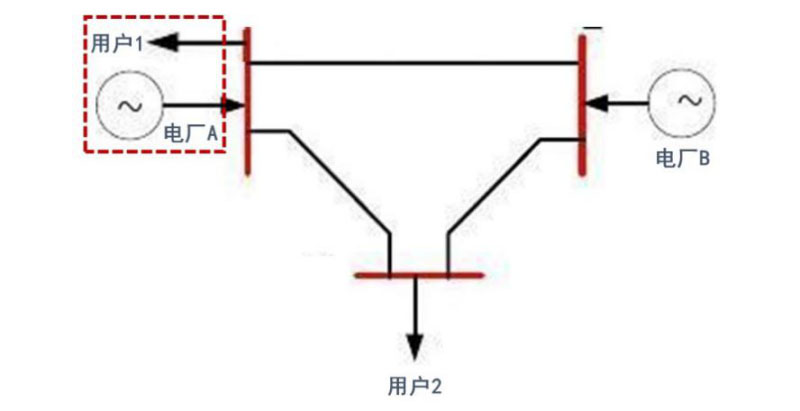 這當(dāng)然是一種非常直觀的公平性問題處理方式,但是否是唯一選擇呢?PJM市場(chǎng)給出了另外一種選擇的可能性。美國(guó)PJM市場(chǎng)的輸電價(jià)格形成機(jī)制與我國(guó)極為接近,即采用郵票法,換而言之,本例中的用戶1與用戶2輸配電價(jià)格是相同的(區(qū)域間配電價(jià)格略有差異,此處暫假定為相同)。用戶供能成本的差異則通過現(xiàn)貨市場(chǎng)中的交易電價(jià)予以體現(xiàn)。由于PJM市場(chǎng)中現(xiàn)貨交易采用的是節(jié)點(diǎn)邊際電價(jià)模式,包括了能量分量、網(wǎng)損分量及阻塞分量,這種不同用戶間的電價(jià)差異主要通過阻塞分量解決。通常而言,與電源電氣距離越接近的用戶現(xiàn)貨價(jià)格越低,即用戶1電量對(duì)應(yīng)的發(fā)電電價(jià)相對(duì)較低,用戶2則由于存在潛在的阻塞問題,現(xiàn)貨價(jià)格通常高于用戶1。