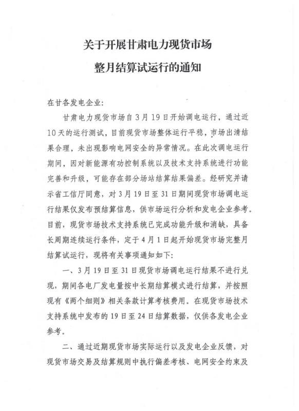 近日,甘肅電力調(diào)度中心發(fā)布《關(guān)于開展甘肅電力現(xiàn)貨市場整月結(jié)算試運行的通知》。《通知》提出,目前現(xiàn)貨市場技術(shù)支持系統(tǒng)已完成功能升級和消缺,具備長周期連續(xù)運行條件,定于4月1日起開始現(xiàn)貨市場完整月結(jié)算試運行。