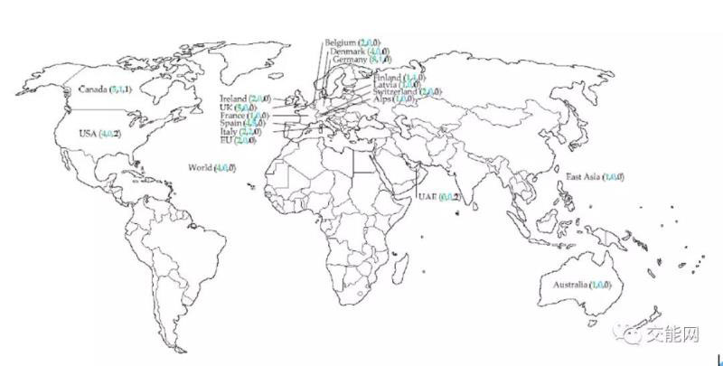括號中的值(x,y,z)分別指示特定地理區(qū)域的區(qū)域/國家、分布式和核能輔助公開的 PtG 部署研究的數(shù)量(來源:A Review of Projected Power-to-Gas Deployment Scenarios)