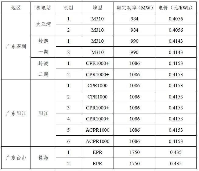 廣東現(xiàn)役的核電站有大亞灣核電站、嶺澳核電站一期項(xiàng)目、嶺澳核電站二期項(xiàng)目、陽江核電及襟島核電廠,綜合投產(chǎn)年份和堆型不同,核電機(jī)組上網(wǎng)電價(jià)也不同,詳見表1。