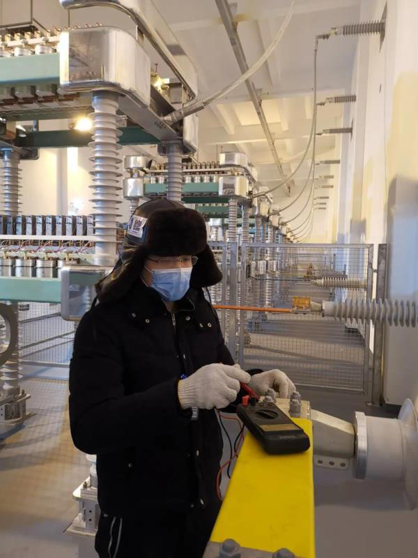 張北柔直工程張北換流站林宇龍對系統(tǒng)調試前接觸電阻開展測量工作。喬平 攝