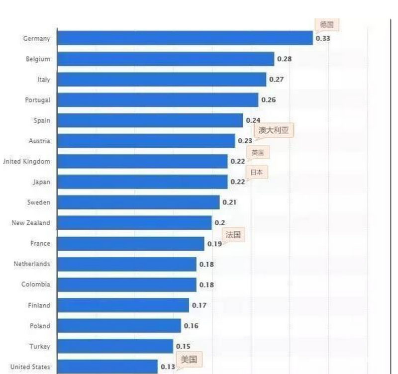 下表數(shù)據(jù)顯示,按照2018年平均匯率計算,德國平均電價水平0.33美元/度(折合人民幣2.184元/度)是最高的,其次是澳大利亞、英國、日本、法國、美國、加拿大(2018年人民幣平均匯率為1美元兌6.6174元人民幣)。