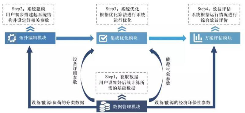 CloudIEPS包含四大模塊,分別是數(shù)據(jù)管理模塊、 拓?fù)渚庉嬆K、集成優(yōu)化模塊和方案評(píng)估模塊,通過流程化設(shè)計(jì)引導(dǎo)用戶快捷操作,各模塊相互配合協(xié)作,共同完成綜合能源系統(tǒng)的規(guī)劃設(shè)計(jì)。