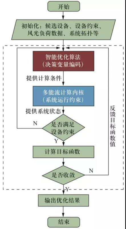 在能源互聯(lián)網(wǎng)規(guī)劃中,由于系統(tǒng)還未建成運(yùn)行,數(shù)字孿生參與其中的主要作用是對(duì)規(guī)劃系統(tǒng)建模仿真,并將結(jié)果反饋給規(guī)劃主體以指導(dǎo)規(guī)劃決策。數(shù)字孿生可以檢驗(yàn)運(yùn)行方案的可行性,計(jì)算運(yùn)行成本、資源短缺量、碳排放量等指標(biāo)評(píng)估運(yùn)行方案的效果,并提供系統(tǒng)工作點(diǎn)詳細(xì)信息。利用攝動(dòng)參數(shù)后的多次仿真,能夠幫助運(yùn)行優(yōu)化尋找搜索方向?;跀?shù)字孿生仿真驅(qū)動(dòng)的優(yōu)化算法如下圖所示: