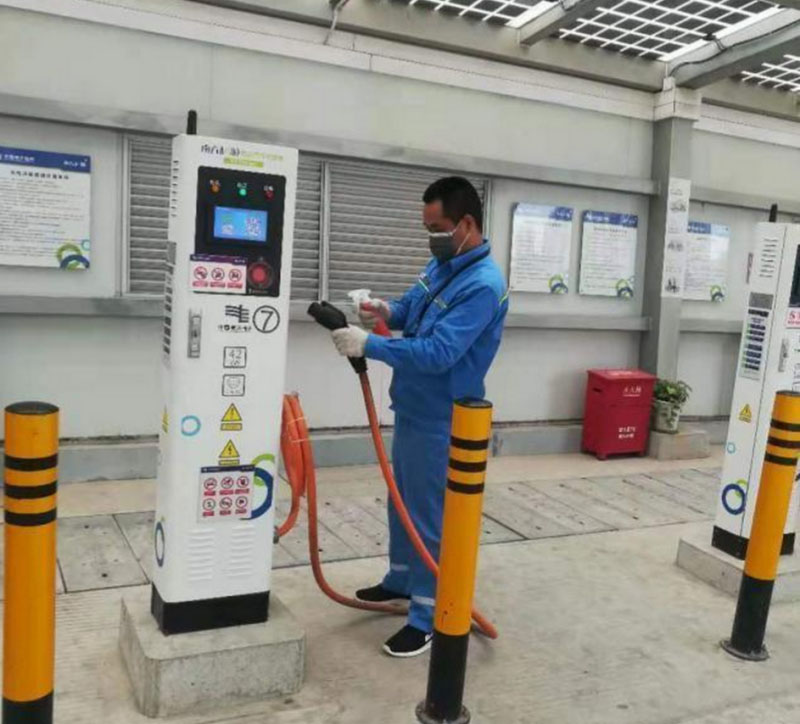 工作人員對充電站內(nèi)充電區(qū)域進(jìn)行消毒清潔。南方電網(wǎng)電動汽車服務(wù)有限公司供圖