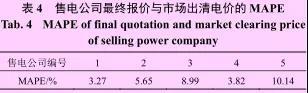 達(dá)到貝葉斯納什均衡后,若各售電公司均按表 3進(jìn)行報(bào)價(jià),不考慮網(wǎng)絡(luò)約束, ETC 按各售電公司所報(bào)電價(jià)由低到高進(jìn)行錄用,售電公司 1 、 2 、 4 售出全部電量,售電公司 3 售出部分電量,而售電公司由于報(bào)價(jià)太高而沒(méi)有被選中。各售電公司采用本文模型制定的報(bào)價(jià)均低于市場(chǎng)出清價(jià),最終報(bào)價(jià)與市場(chǎng)出清的MAPE 值見(jiàn)表 4 。