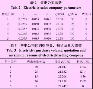 本文假設(shè)網(wǎng)絡(luò)不存在阻塞現(xiàn)象。電力市場(chǎng)存在5 家售電公司參與競(jìng)爭(zhēng),其相關(guān)參數(shù)見(jiàn)表 2 。市場(chǎng)需求電量為 100 MW 。