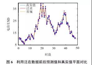 利用 2 個(gè)神經(jīng)網(wǎng)絡(luò)分別對(duì) 10 月 16 日 48 個(gè)點(diǎn)進(jìn)行實(shí)時(shí)電價(jià)預(yù)測(cè)。圖 5 為經(jīng)過(guò)利用泛在數(shù)據(jù)前后的出清電價(jià)預(yù)測(cè)值和真實(shí)電價(jià)值的三維對(duì)比圖。圖 6為三者對(duì)比的平面圖,即圖 5 的正視圖。