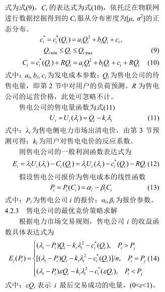 2019 年國(guó)家電網(wǎng)提出建設(shè)“泛在電力物聯(lián)網(wǎng)”,實(shí)現(xiàn)電力系統(tǒng)各環(huán)節(jié)萬(wàn)物互聯(lián)。新一輪電力體制改革下產(chǎn)生的售電公司如何利用龐大的數(shù)據(jù)信息在電力市場(chǎng)競(jìng)爭(zhēng)中獲得最大利潤(rùn)成為其關(guān)注的最重要核心問(wèn)題。以泛在電力物聯(lián)網(wǎng)建設(shè)為背景,研究了含火電和風(fēng)電的綜合能源發(fā)電商成立的售電公司參與電力市場(chǎng)競(jìng)爭(zhēng)的營(yíng)銷策略問(wèn)題。首先介紹了泛在電力物聯(lián)網(wǎng)的數(shù)據(jù)應(yīng)用特性。以泛在物聯(lián)網(wǎng)提供的實(shí)時(shí)全面的數(shù)據(jù)信息平臺(tái)為基礎(chǔ),在海量數(shù)據(jù)中進(jìn)行精準(zhǔn)快速的查找提取,創(chuàng)新性引入了“氣象相似日”概念,創(chuàng)建了附加自適應(yīng)動(dòng)態(tài)規(guī)劃校正環(huán)節(jié)的小波神經(jīng)網(wǎng)絡(luò)模型對(duì)用戶負(fù)荷需求進(jìn)行了預(yù)測(cè)。通過(guò)泛在物聯(lián)網(wǎng)收集的全面實(shí)時(shí)數(shù)據(jù),引入了模糊聚類的方法,并采用遺傳算法對(duì) BP 神經(jīng)網(wǎng)絡(luò)模型進(jìn)行改進(jìn),提高了對(duì)短期市場(chǎng)出清電價(jià)的預(yù)測(cè)準(zhǔn)確度,為競(jìng)價(jià)策略的制定奠定基礎(chǔ);其次基于泛在數(shù)據(jù)下報(bào)價(jià)的概率密度函數(shù),構(gòu)建了售電公司的貝葉斯博弈競(jìng)價(jià)模型,通過(guò)求取貝葉斯納什均衡解得到最優(yōu)電力營(yíng)銷策略;最后對(duì)實(shí)際算例進(jìn)行求解,進(jìn)一步驗(yàn)證所提方法的實(shí)操性。
