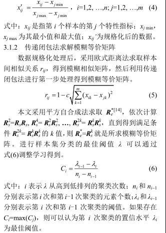 為有效地對(duì)樣本進(jìn)行分類,假設(shè)共有 n 個(gè)樣本,m 個(gè)特性指標(biāo),則可構(gòu)造一個(gè) n×m 的原始矩陣。并采用式 (4) 對(duì)歷史電價(jià)和負(fù)荷的特性指標(biāo)進(jìn)行數(shù)據(jù)規(guī)格化 ( 歸一化 ) 處理。