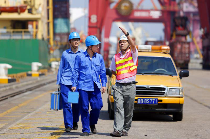 國(guó)網(wǎng)寧波供電公司工作人員在北侖梅山港區(qū)交流指導(dǎo)智慧港口岸電建設(shè)。王幕賓 攝