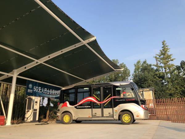 無人駕駛的“5G電動微公交”在進行無感充電 王海燕 攝
