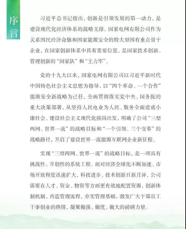 緊緊圍繞公司“三型兩網(wǎng)、世界一流”戰(zhàn)略目標(biāo),分序言、公司發(fā)展戰(zhàn)略核心要義、企業(yè)管理創(chuàng)新基本概念、公司管理創(chuàng)新總體思路、公司管理創(chuàng)新重點(diǎn)領(lǐng)域、公司管理創(chuàng)新工作體系、問題解答等七個(gè)篇章,以全景的視角、系統(tǒng)的理念對公司管理創(chuàng)新工作進(jìn)行了詳細(xì)的闡述。