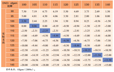 Ofgem 已經(jīng)在使用的一個(gè)機(jī)制是規(guī)制菜單。我們這里透過(guò)表 2 來(lái)說(shuō)明。DNO 在它的商業(yè)計(jì)劃中會(huì)提出一個(gè)關(guān)于在價(jià)格控制期間資本花費(fèi)的底線數(shù)字,這個(gè)價(jià)格數(shù)字會(huì)經(jīng)由 Ofgem 所委托的顧問(wèn)公司來(lái)加以審核。這個(gè)審核過(guò)程會(huì)產(chǎn)生一個(gè)比率。如果受管制的公司 DNO 所送出的花費(fèi)數(shù)字跟 Ofgam 所委托的顧問(wèn)公司所提出的一致,那么這個(gè)比率就會(huì)是 100。計(jì)算出的這個(gè)比率越高,就代表這個(gè)受管制評(píng)估的公司越?jīng)]有在控制它自身花費(fèi)上積極。為了回饋比較具有積極性的企業(yè),這些企業(yè)會(huì)被提供更高的基線報(bào)酬,并且可以有更多的利益分享安排。而這個(gè)激勵(lì)的數(shù)字,必須低于基本花費(fèi)的數(shù)額。表 2 中被標(biāo)示起來(lái)的數(shù)字,就顯示那些被指定公司,它們?cè)趯?shí)際花費(fèi)上的影響力。