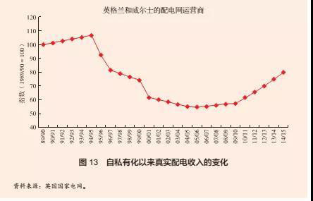 對(duì)配電費(fèi)用的激勵(lì)性監(jiān)管大大降低了配電費(fèi)用。1995 年監(jiān)管機(jī)構(gòu)首次重置費(fèi)用,到 2005 年英格蘭和威爾士配電公司平均價(jià)格下跌了約 50%,而某些地區(qū)下降更多(例如英格蘭西南部的西南電力局)。圖 13 顯示了私有化以來(lái)英格蘭和威爾士實(shí)際配電費(fèi)用的下降, A 下跌幅度大于英格蘭和威爾士整體的輸電費(fèi)用。但與此同時(shí),服務(wù)質(zhì)量卻大幅提升,用戶平均停電時(shí)間從 1990 年的每年 100 多分鐘下降到如今的 30 分鐘左右。