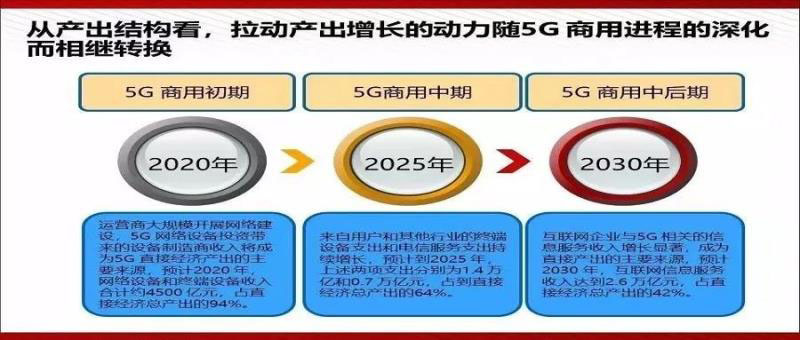 中國信息通信研究院預(yù)計,2020到2025年期間,中國5G商用間接拉動的經(jīng)濟總產(chǎn)出約24.8萬億元,間接帶動的經(jīng)濟增加值達8.4萬億元。
