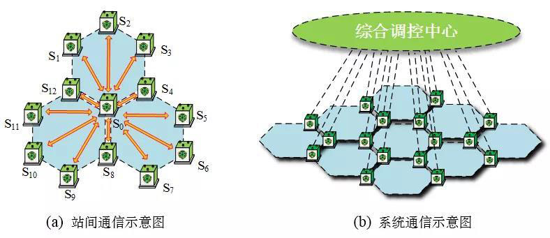 2)站間通信與系統(tǒng)通信的雙層通信機制:站間通信是指基站與關(guān)聯(lián)微網(wǎng)的所有基站之間的相互通信,對關(guān)聯(lián)微網(wǎng)運行狀態(tài)信息的實時共享。系統(tǒng)通信是指各基站與上層綜合調(diào)控中心之間的通信,確保上層綜合調(diào)控中心實時掌握有源配電網(wǎng)中全部微網(wǎng)的運行狀態(tài),以便做出全局優(yōu)化調(diào)控決策和協(xié)調(diào)控制。站間通信和系統(tǒng)通信如圖6(a)和(b)所示。
