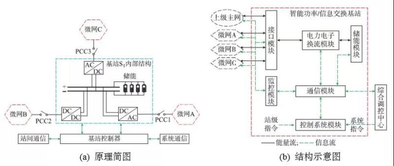 1)智能功率/信息交換基站:智能功率/信息交換基站是一種帶有儲能裝置、多端、可交直流混合接入的電力電子設(shè)備,主要功能是監(jiān)測關(guān)聯(lián)微網(wǎng)的運行狀態(tài)、功率平衡輔助控制以及信息交互處理等。它是實現(xiàn)本文所提蜂巢狀有源配電網(wǎng)拓撲的核心設(shè)備與關(guān)鍵技術(shù),它的結(jié)構(gòu)示意圖和原理簡圖分別如圖5(a)和(b)所示。