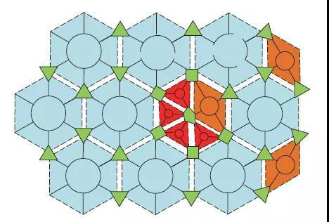 實際工程中,微網(wǎng)的關(guān)聯(lián)拓撲結(jié)構(gòu)可根據(jù)配電網(wǎng)規(guī)模、劃分的微網(wǎng)區(qū)域/數(shù)量大小、供電可靠性與靈活性以及經(jīng)濟性等多方面綜合優(yōu)化確定,如某一供電區(qū)域大部分以六邊形結(jié)構(gòu)的微網(wǎng)鋪展覆蓋,但少部分區(qū)域仍可以根據(jù)實際需求選擇以三角形或四邊形的微網(wǎng)鋪展,即圖4中的紅色和橙色區(qū)域所示。