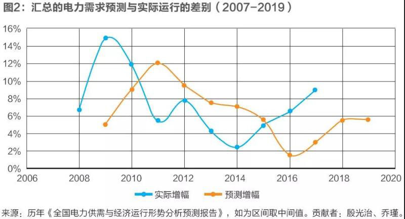中國(guó)電力企業(yè)聯(lián)合會(huì)在近些年均會(huì)發(fā)布過(guò)去一年的電力回顧以及新一年的電力展望。卓爾德中心對(duì)這些展望以及實(shí)際的電力增長(zhǎng)進(jìn)行了比較。結(jié)果如下??梢钥闯觯瑑H僅是1年的提前量,其預(yù)期與實(shí)際的差別也可以用“巨大”來(lái)形容。