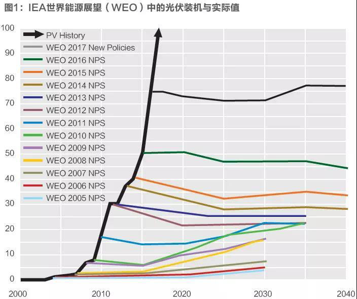 當(dāng)然,這不是我國(guó)能源工作者的問(wèn)題,而是世界各國(guó)各機(jī)構(gòu)普遍存在的現(xiàn)象。如圖1所示,國(guó)際能源署在10年周期以上的光伏預(yù)測(cè)結(jié)果偏差過(guò)大引來(lái)NGO組織的苛責(zé)。