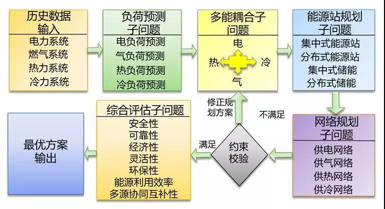 由于多能耦合密切,DIES的優(yōu)化空間廣泛。存在于源、網(wǎng)、荷、儲等 各個環(huán)節(jié)。國內(nèi)外對 DIES規(guī)劃的早期探索主要集中于以某一種典型耦合設(shè)備(CHP和CCHP等)為核心或少數(shù)幾種確定的設(shè)備組成的小型供能系統(tǒng),以及“以熱定電”等相關(guān)運(yùn)行策略的制定,未充分考慮系統(tǒng)設(shè)備選型的優(yōu)化空間。后續(xù)DIES規(guī)劃一般基于Energy Hub理論,并通過分層建模求解實(shí)現(xiàn)設(shè)備選型選址定容與運(yùn)行調(diào)度方案的協(xié)同優(yōu)化。目前對DIES的規(guī)劃工作基本上側(cè)重于某一點(diǎn),如能源站規(guī)劃、能源網(wǎng)絡(luò)規(guī)劃、儲能規(guī)劃或綜合需求側(cè)管理等,尚未形成較成熟的源、網(wǎng)、荷、儲一體化規(guī)劃,對于各環(huán)節(jié)間的耦合與優(yōu)勢互補(bǔ)挖掘不足。綜合目前的研究工作,完整的DIES規(guī)劃應(yīng)如下圖所示。