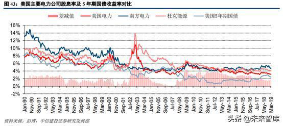 從美國主要電力公司股息率趨勢來看,其股息率整體震蕩下行,與美國5年期國債收益率趨勢較為一致。近年來三家公司股息率均值減去國債收益率的差減值相對穩(wěn)定,我們判斷相關公司估值中樞上移有較大因素是受無風險利率下行推動所致。