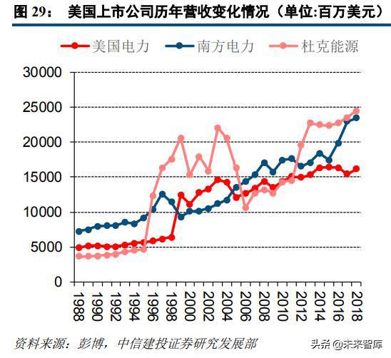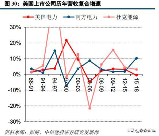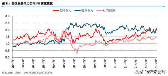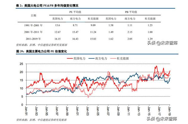 從美國電力等三家公司近三十年的PE估值水平來看,其估值波動區(qū)間主要在10-20倍之間且呈現震蕩上行趨勢。我們將時間劃分為1991年-2001年、2001年-2011年及2011-2019年三個區(qū)間,美國電力、南方電力和杜克能源的平均PE分別為13.6/8.71/9.09、12.67/15.47/11.24、16.15/16.43/15.83,市盈率估值穩(wěn)步提升的趨勢較為明顯。