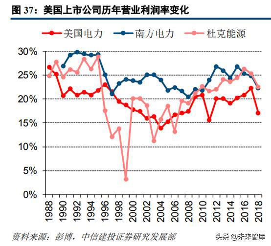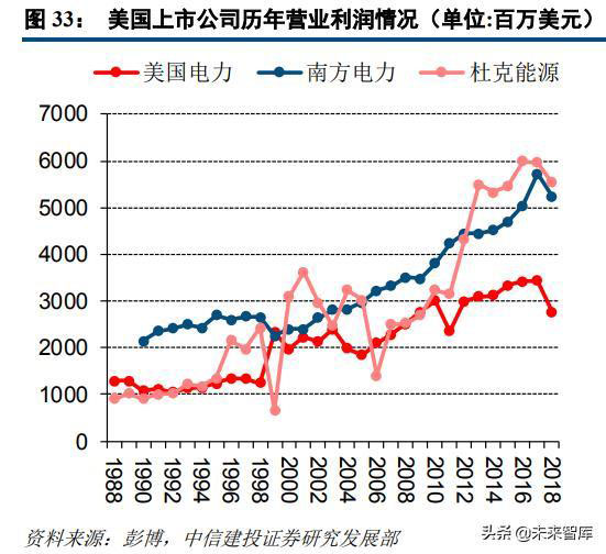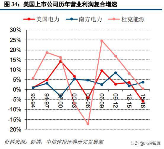從美國上市公司的盈利情況來看,雖然年際間營業(yè)利潤情況有所波動,但整體仍保持穩(wěn)健提升的趨勢。自2011年之后,相關企業(yè)營業(yè)利潤及增速保持相對平穩(wěn),波動幅度較之前的年份有所收窄。在前面我們對于美國電力市場化進程及機制的分析中也可以看到,以PJM為代表的一系列區(qū)域輸電組織已形成了相對完備的電力市場化交易機制,通過長期合約、期貨、現貨等一系列交易手段,電力的商品屬性及真實價格得到充分體現。發(fā)電企業(yè)可以依據電力供需格局及能源價格,合理調整發(fā)電側報價,在一定程度上可以轉移燃料成本波動對于自身盈利能力的沖擊影響。