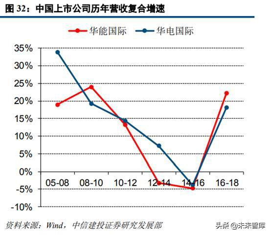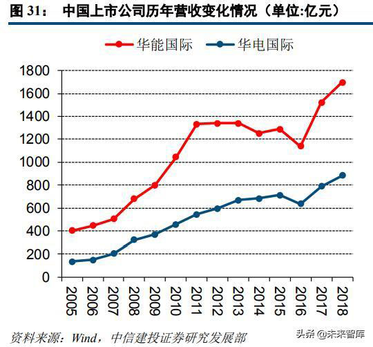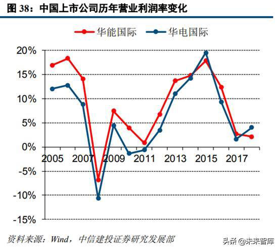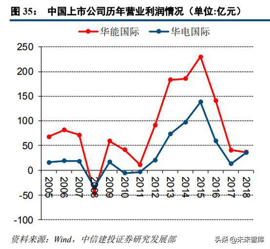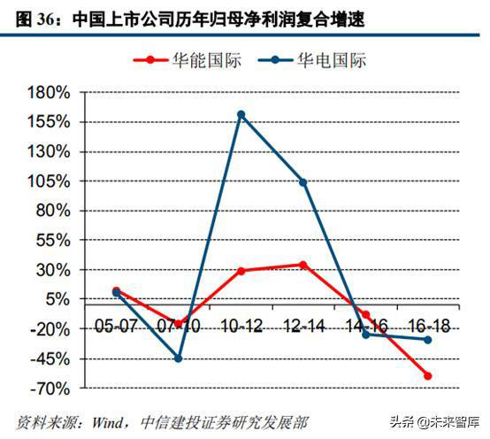 從營收復合增速來看,從2005年至2016年華能國際與華電國際的營收復合增速均處于下降通道。我們判斷主要是受我國發(fā)用電增速下臺階以及基數效應影響所致。2016-2018年兩公司營收復合增速觸底回升,主要受用電需求回暖、2017年7月份部分省份上調燃煤標桿電價、新機組投產及資產注入等因素影響。