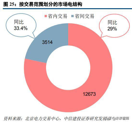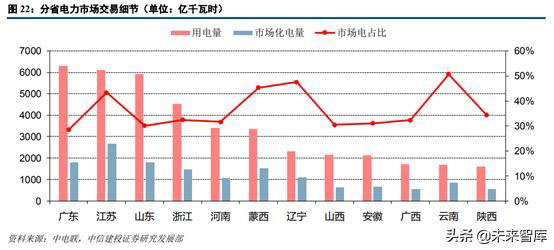 從分省電力市場交易細節(jié)來看,市場交易電量占全社會用電量比重較高省份主要有云南(50.7%)、遼寧(47.6%)、蒙西(45.3%)和江蘇(43.4%)。市場電量絕對值較高的省份包括江蘇(2657億千瓦時)、廣東(1805億千瓦時)、山東(1783億千瓦時)、浙江(1470億千瓦時)、蒙西(1256億千瓦時)、遼寧(1097億千瓦時)和河南(1080億千瓦時)。