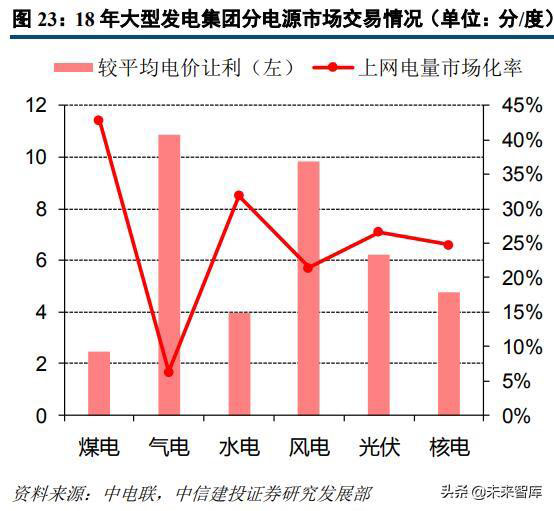 2018年大型發(fā)電集團上網電量合計36587億千瓦時,同比增長11%;其市場交易電量合計13713億千瓦時(不含發(fā)電權交易),同比增長26.4%,占大型發(fā)電集團合計上網電量的37.5%,較上年提高4.5個百分點。從分電源情況來看,煤電機組上網電量市場化率最高,達42.8%,市場電較平均電價讓利為2.45分/千瓦時;水電上網電量市場化率排名第二,達31.9%,市場電較平均電價讓利為3.96分/千瓦時。風電、氣電等電源市場化率相對較低,對應度電讓利較高。