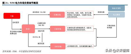 接下來我們以美國最早推動改革、市場化程度最高的PJM市場為例,對美國的電力現貨及期貨市場、輔助服務市場、交易及運行模式等做進一步討論。PJM作為美國首個區(qū)域輸電組織(RTO),負責美國大西洋沿岸13個州及哥倫比亞特區(qū)的電力系統(tǒng)運行與管理。在多年的發(fā)展歷程中,其形成了監(jiān)控電網平衡穩(wěn)定運營的運營職能(相當于我國電網調度中心)、推動電力交易市場化的市場化職能(相當于我國電力交易中心)和制定電網發(fā)展規(guī)劃的規(guī)劃職能。PJM不擁有發(fā)電機組、輸配電資產或者其他電力設施,其本質上是電力市場的獨立第三方,致力于實現電力市場化交易的可靠性和高效性。PJM是世界上第四大集中調度的互聯(lián)電網,也是美國乃至全球電力市場化運營的標桿。