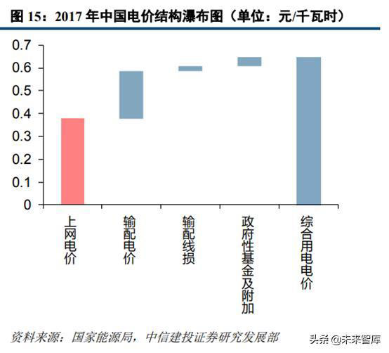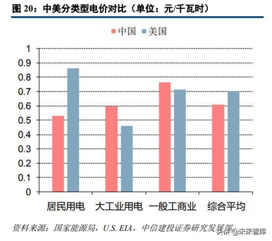 4、從電價結構來看,中美電價組成較為相似,主要差異在于我國最終銷售電價中還包含政府性基金及附加。目前中美電價水平整體較為接近,不過從分類用電價格來看,我國居民用電價格顯著低于一般工商業(yè)及大工業(yè)用電,存在明顯的交叉補貼,與美國有一定的差異。