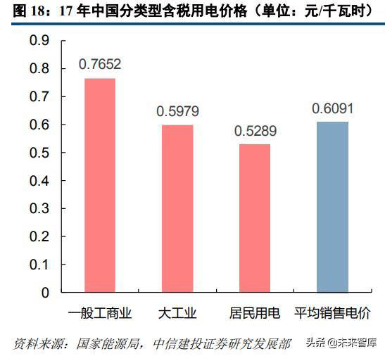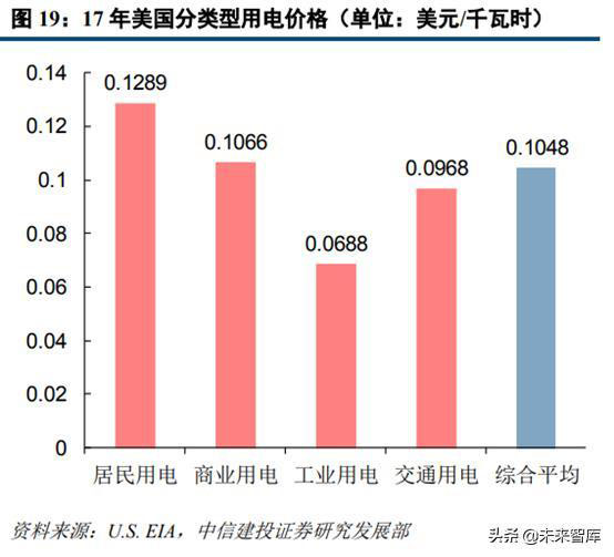 從2017年分類型用電價格的數據來看,中美電價水平整體較為接近,但美國居民用電價格大幅高于中國。我國一般工商業(yè)的平均用電電價較高,為0.76524元/千瓦時,大工業(yè)和居民用電的平均電價分別為0.59785元/千瓦時和0.52894元/千瓦時。而美國平均用電價格最高的用戶類型為居民用電,為0.1289美元/千瓦時,商業(yè)用電、交通用電和工業(yè)的平均電價則相對較低,分別為0.1066、0.0968和0.0688美元/千瓦時(數據來自于EIA,各地州政府或有少量稅費)。