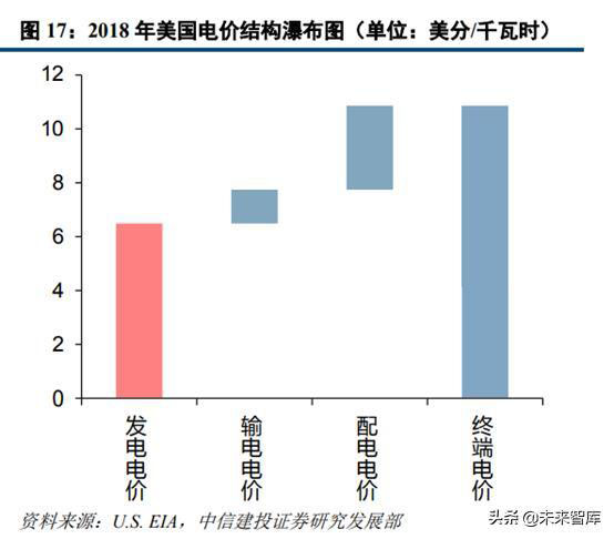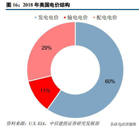 而美國的銷售電價主要由發(fā)電電價、輸電電價以及配電電價構成。2018年美國終端用電價格為10.85美分/千瓦時,其由上網電價(6.49美分/千瓦時)、輸電電價(1.24美分/千瓦時)和配電電價(3.12美分/千瓦時)構成,三者占比分別為60%、11%和29%。